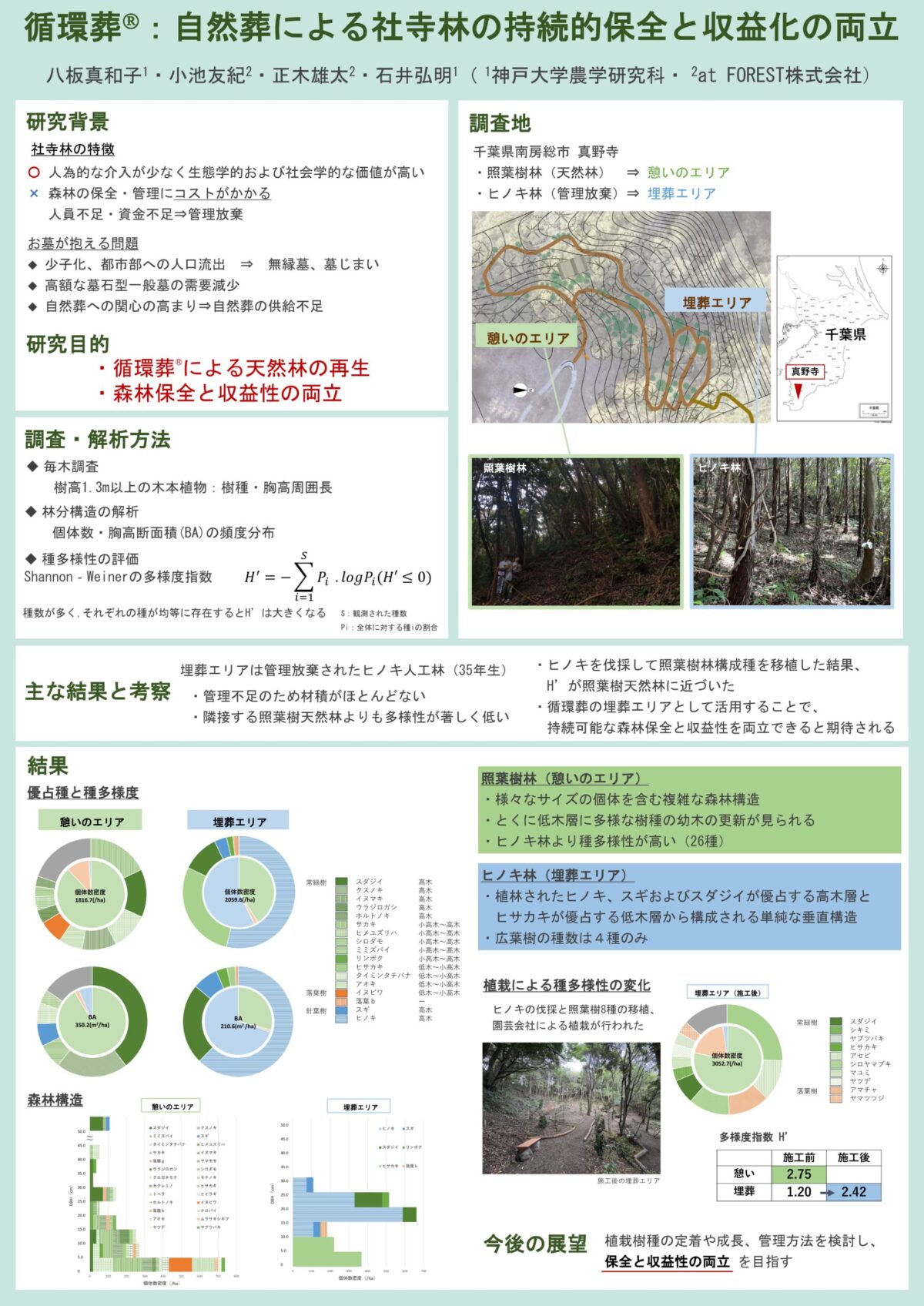 学会での発表にあたり、循環葬のパートナーである神戸大学・石井弘明教授とともに森の植栽調査やマッピング、生物多様性の分析を実施しました。それにより、循環葬の森づくりがどのように自然環境へ寄与しているのかを客観的に説明できる指標を整えることができました。