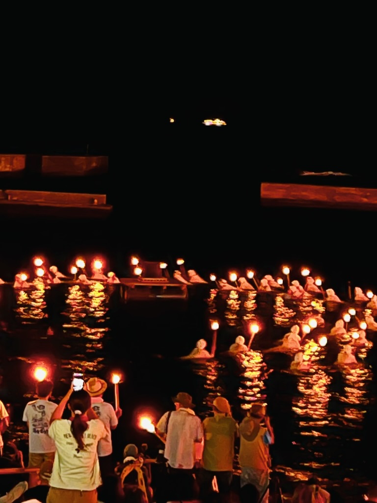 白装束に身を包んだ約100人の海女さんが、松明を手に夜の海を泳ぐ――。