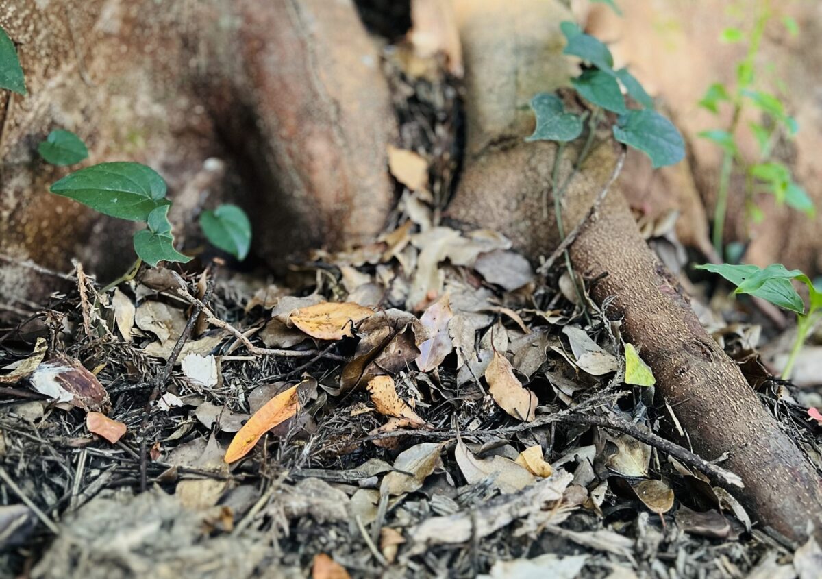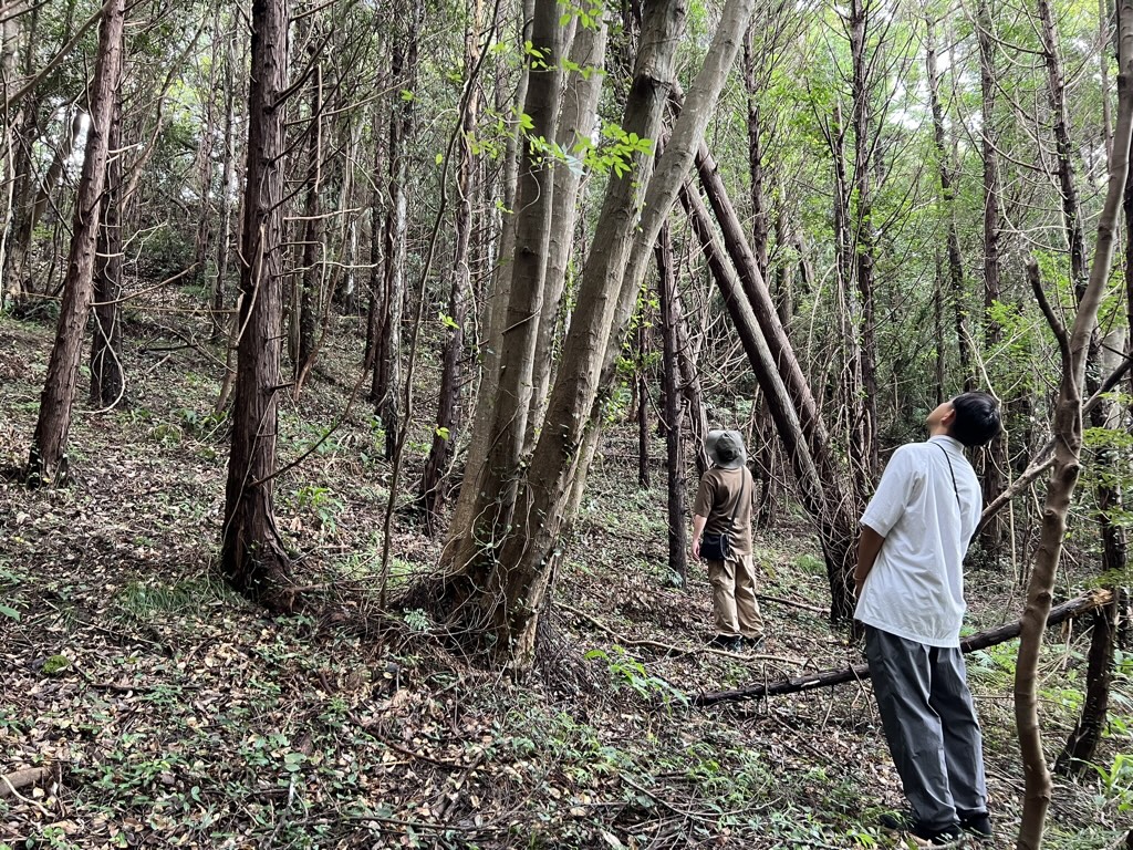 真野寺の森の埋葬エリアの近くでは、シンボルツリーのクスノキ以外にも、切り株から複数の幹が伸びている木を見ることができます。クスノキやスダジイは特に萌芽更新(ほうがこうしん)が盛んな木で、切り株の根や幹に残った力を使って再び芽吹こうとするのだとか。