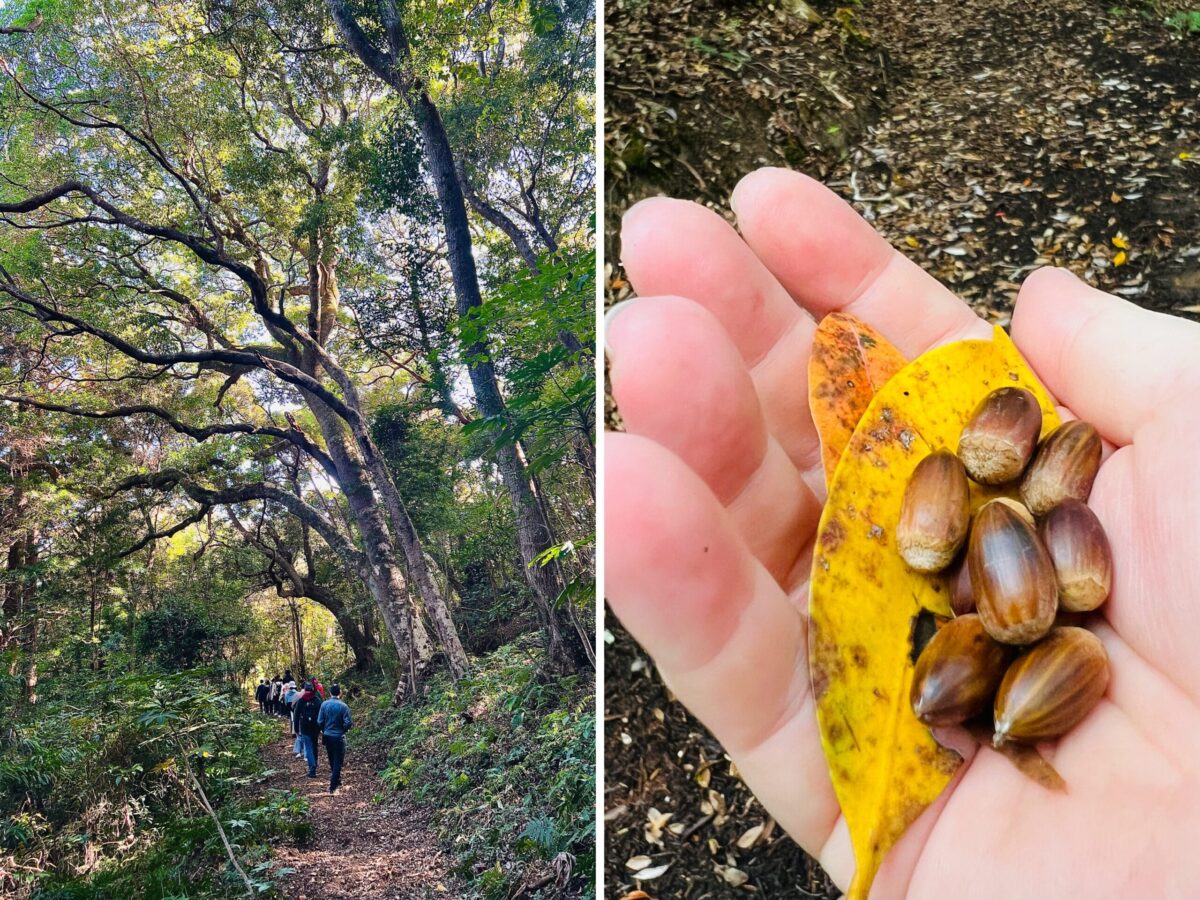 スダジイのどんぐりは少し珍しく、いわゆる帽子を被ったものではありません。実全体を包む薄い殻が熟すとバナナのように裂ける「バナナハット」のような形が特徴です。足元にも目を向けると、森の循環を支える、ささやかな“食べ残し”の物語にも出会うことができます。